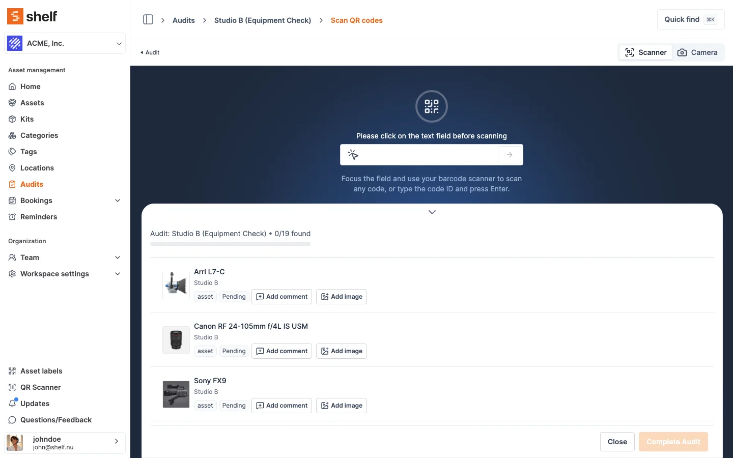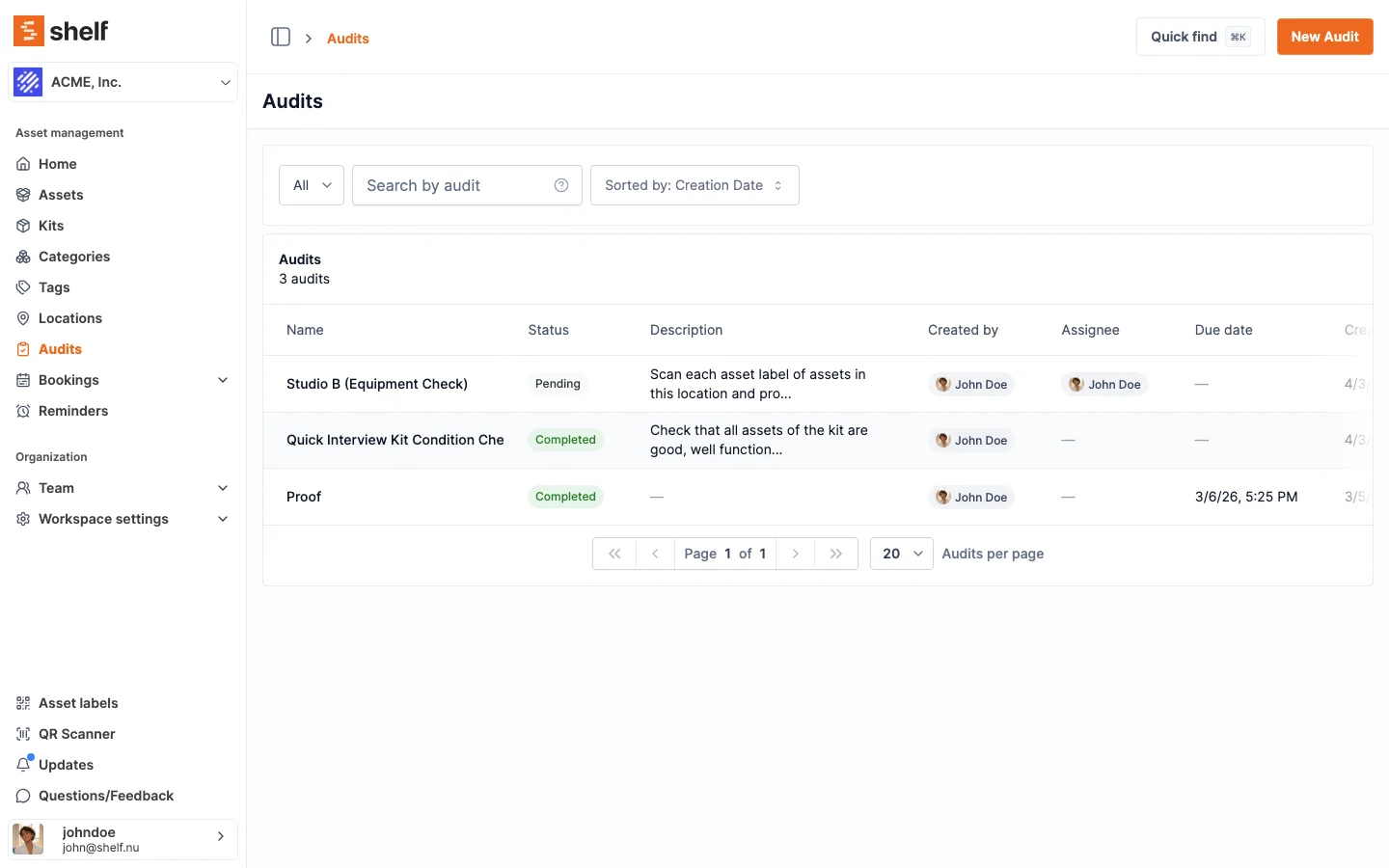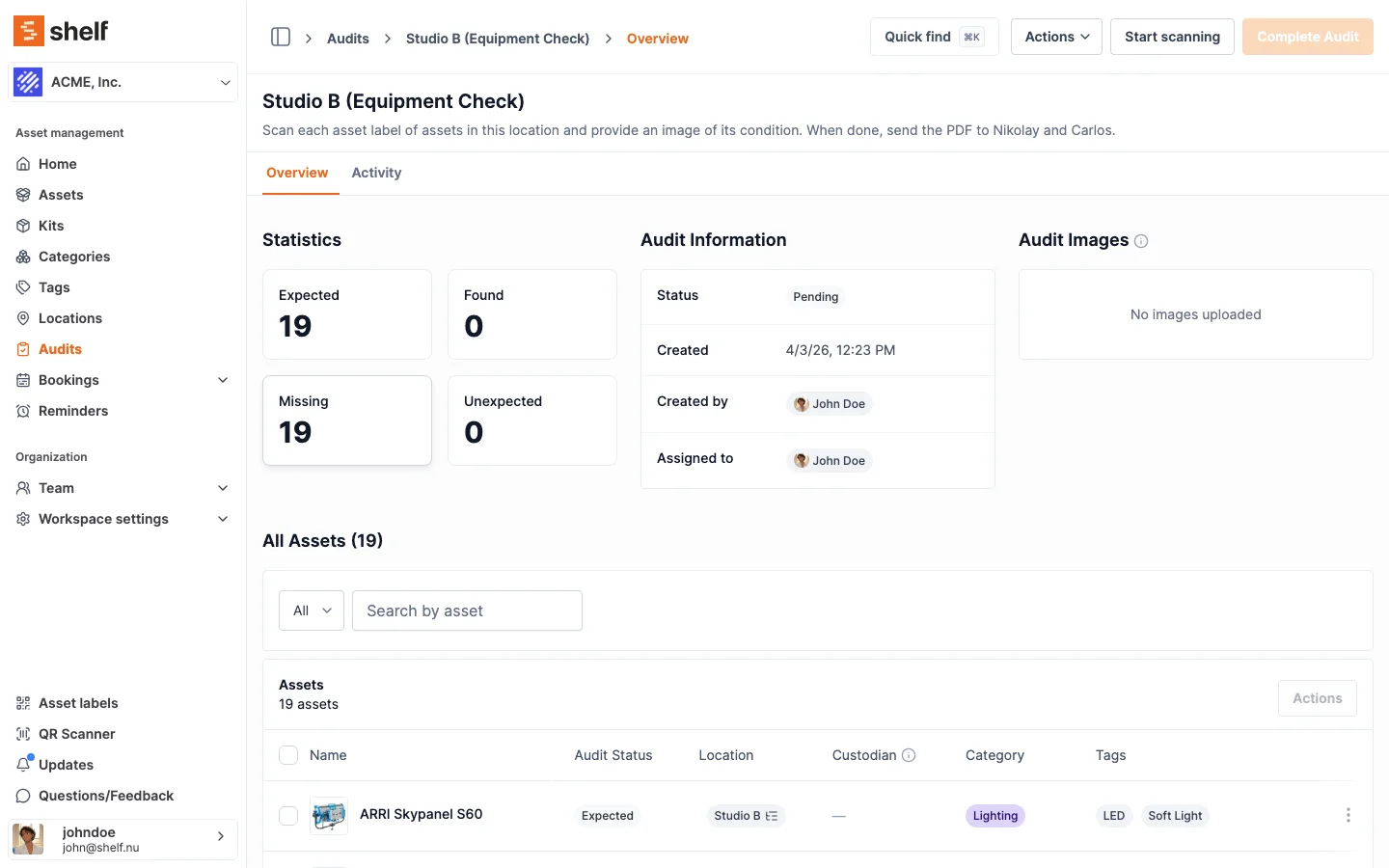 Audits let you verify that your physical inventory matches your records. Define which assets should be in a location, hand someone a phone, and let them scan. Shelf flags what was found, what is missing, and what showed up unexpectedly. When the audit is complete, export a PDF or CSV report.