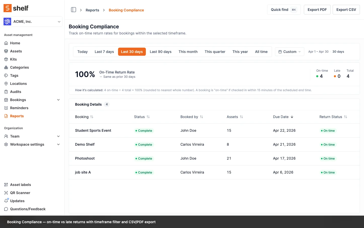 - Booking Compliance — On-time checkouts, late returns, and overdue items across the timeframe you pick. Filter by status, custodian, or location.