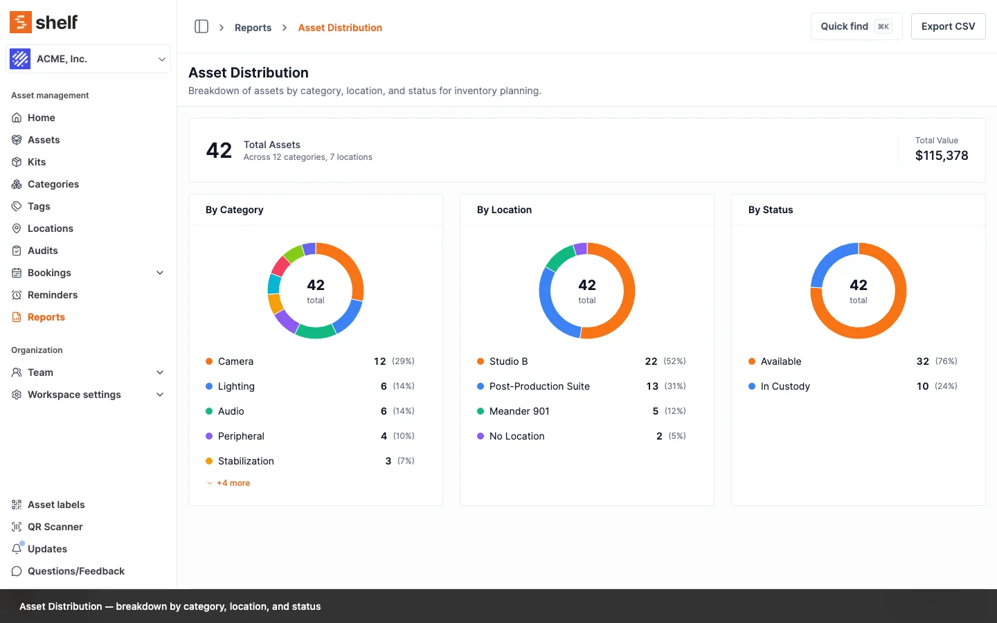 - Asset Distribution — Breakdown by category, location, and status for inventory planning.