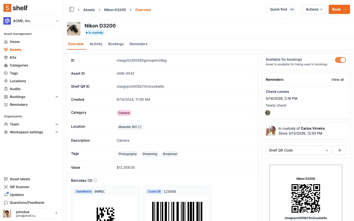 Shelf supports multi-location tracking across studios, storage rooms, and sets. Fast QR scanning keeps location data current, and workspaces separate inventories by department or program.