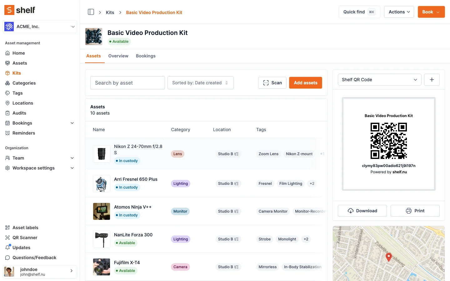 Shelf tracks kits with component-level visibility. When a camera kit returns, the system flags missing accessories automatically. No more incomplete kits sitting in storage.