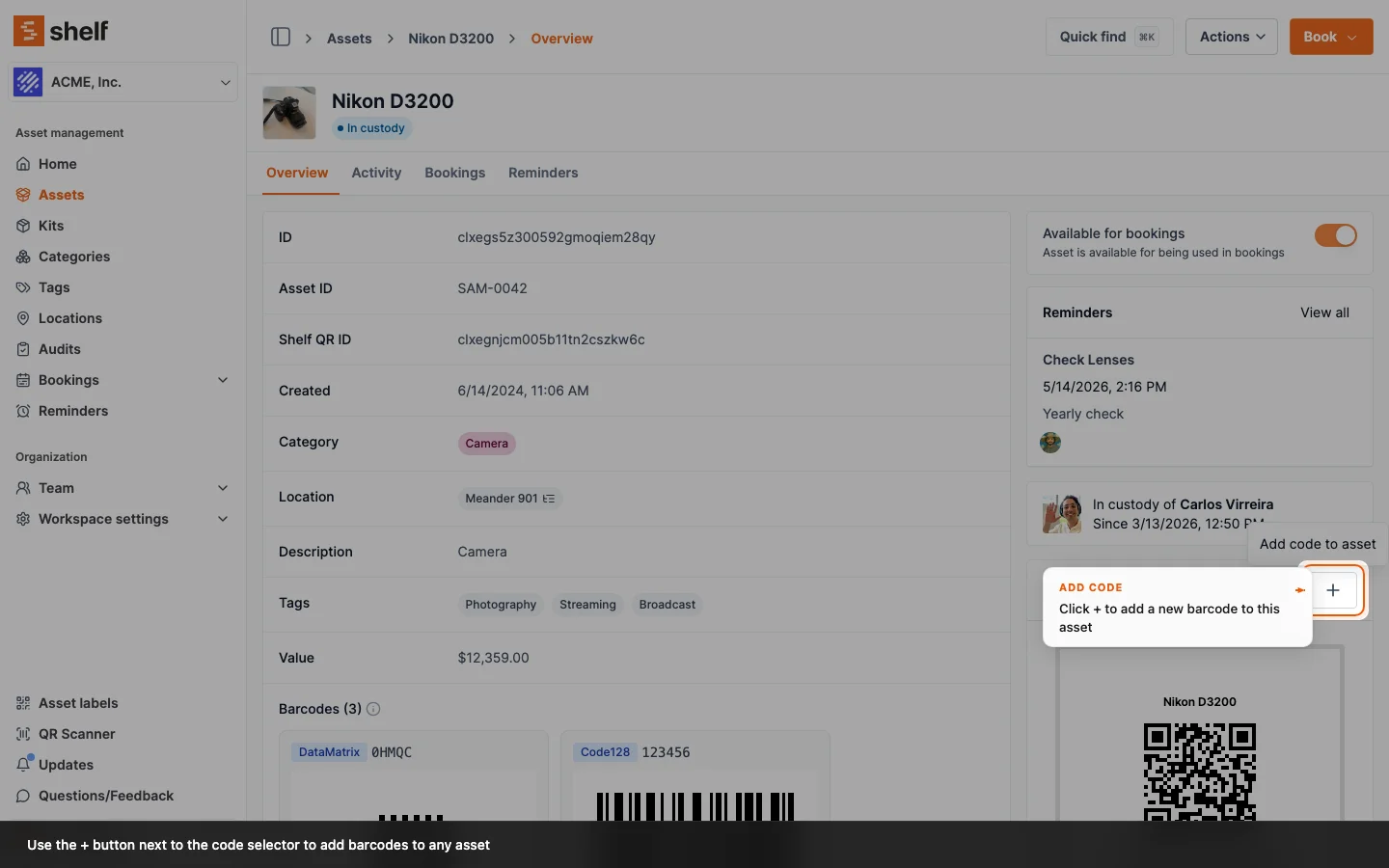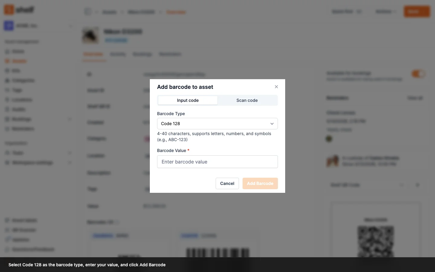 Shelf's alternative barcode feature extends beyond the standard QR codes automatically generated for assets and kits. This paid add-on enables organizations to integrate multiple barcode formats into their asset tracking systems.