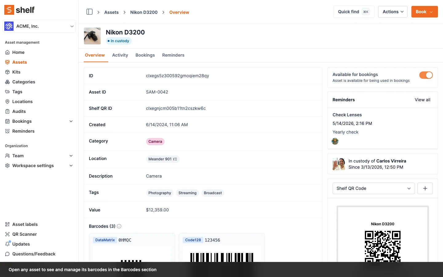 - All barcode types function identically within Shelf's scanning, booking, and check-in systems