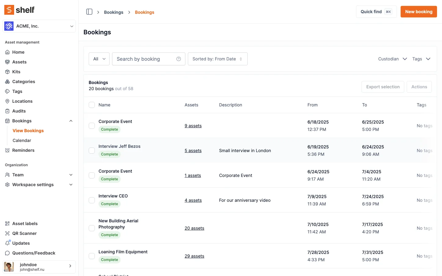 Shelf's booking export feature enables you to extract comprehensive information about your bookings in CSV format. This functionality makes it easier to track equipment usage, allocate costs to projects, generate reports, and maintain accurate records of asset movements.
