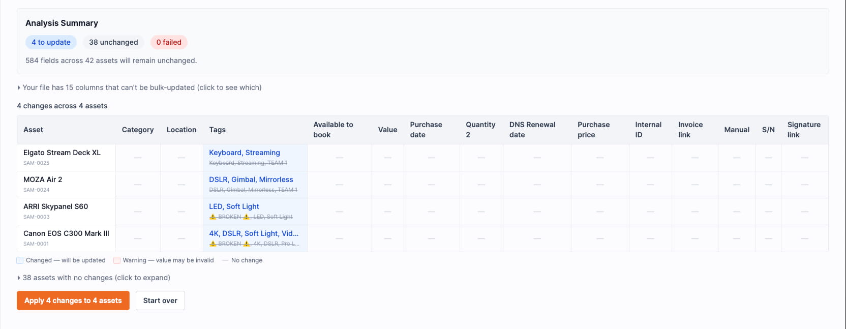 Use the Update Existing Assets workflow to edit asset records in bulk — export to CSV, make changes in Excel or Google Sheets, preview every diff, then apply.