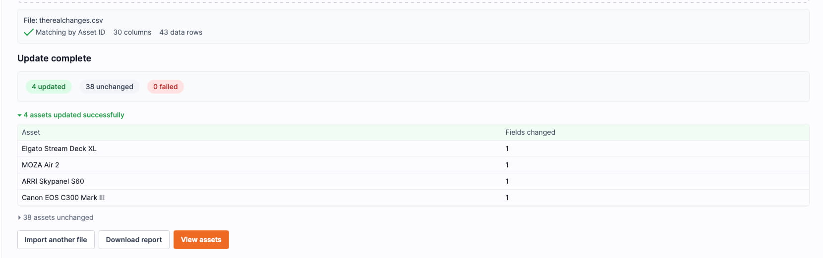 - You can update up to 1,000 assets per file. For larger inventories, split your CSV into multiple files.