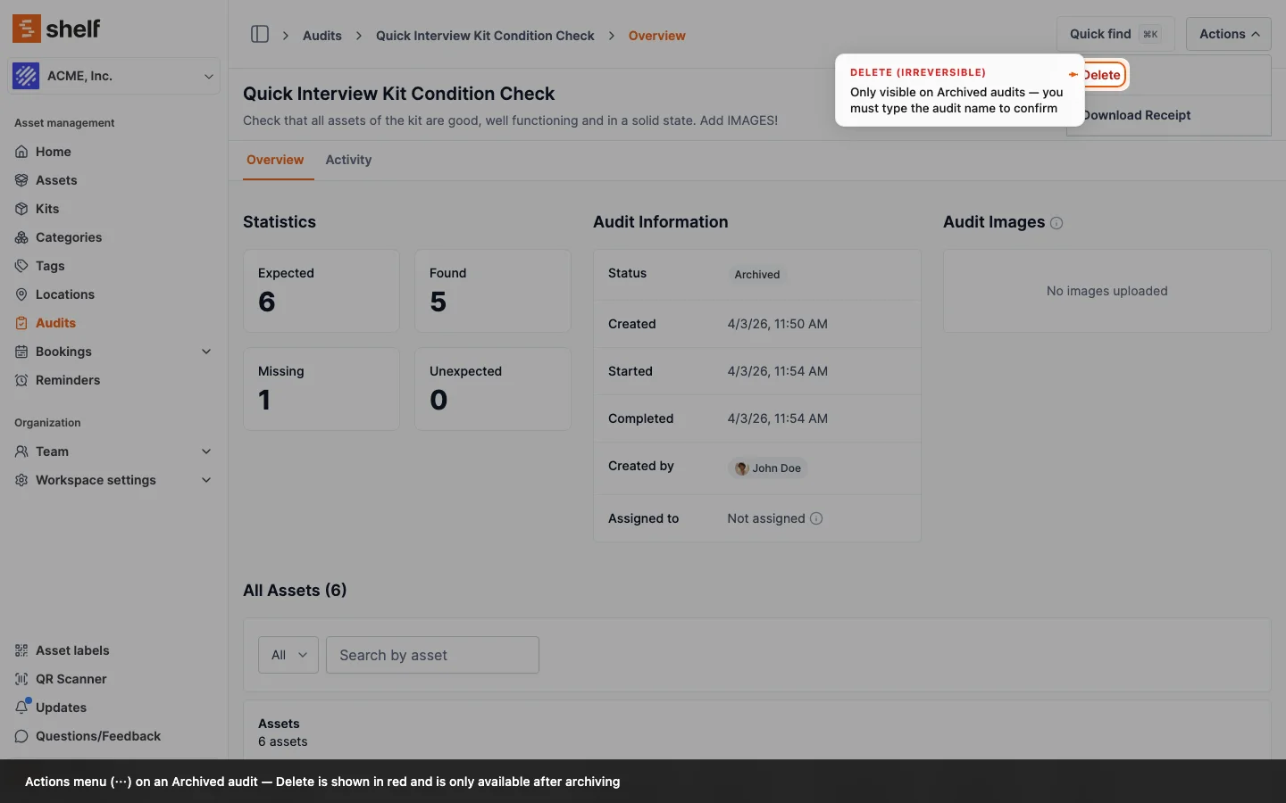 Deletion is only available for Archived audits. Audits must be archived before they can be deleted — Shelf enforces this as a safety step. Only Admin and Owner roles can delete audits.