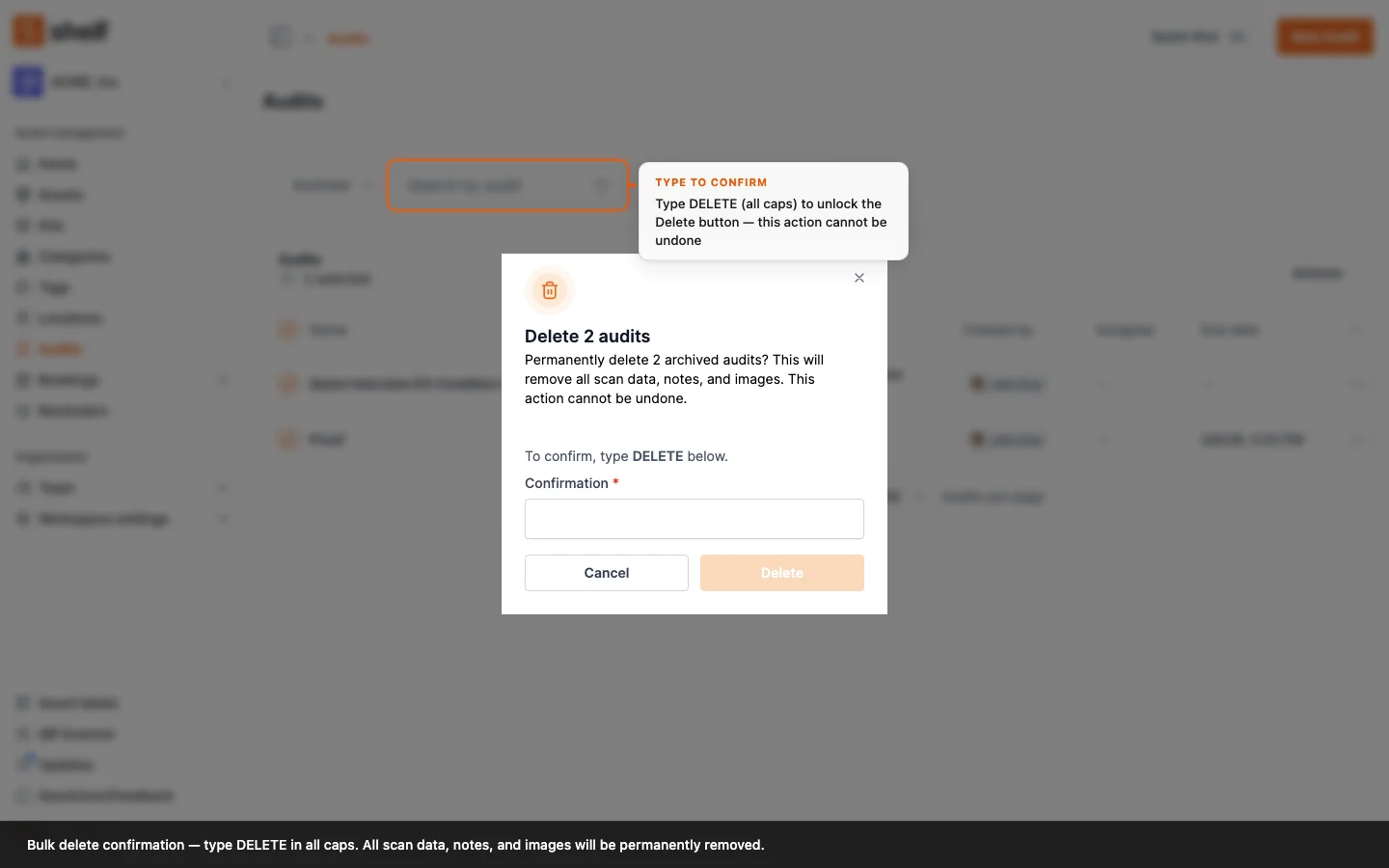 Remove archived audits and all their scan data, notes, and images from Shelf permanently — one at a time or in bulk.