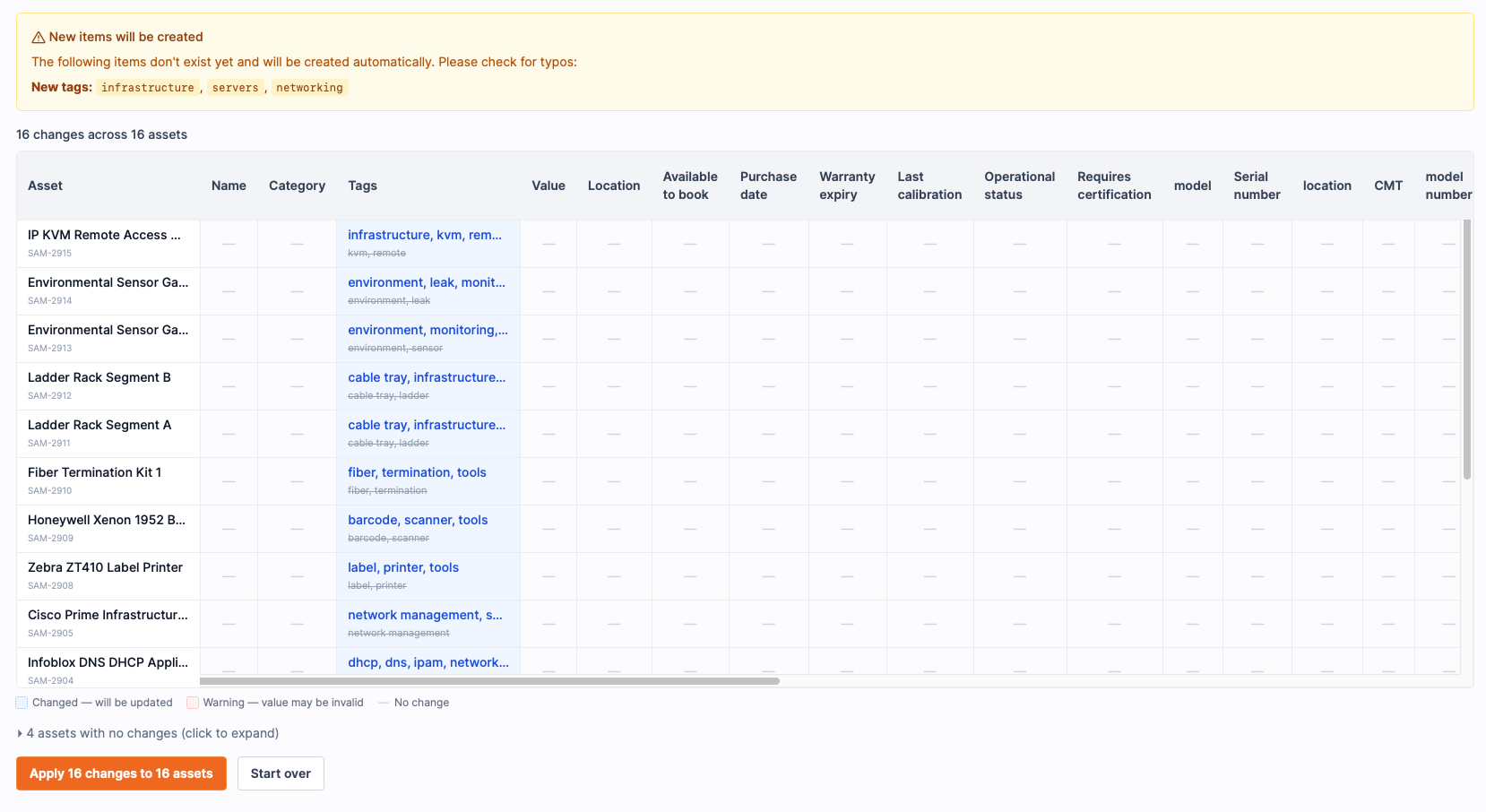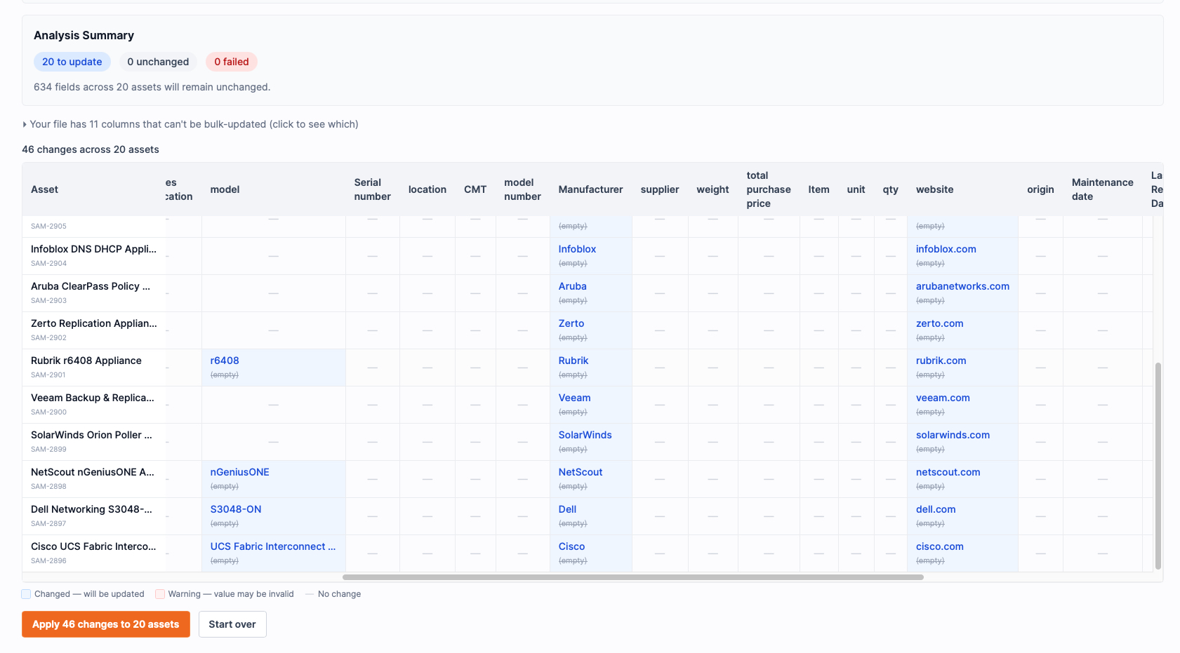 I'm uploading an asset inventory CSV. Many cells are empty.