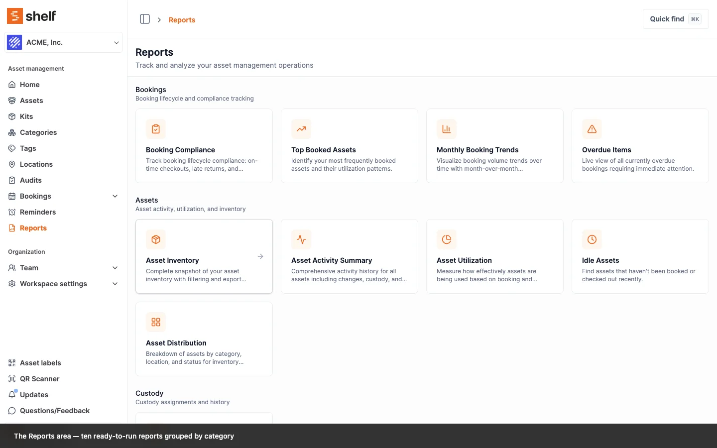 Reports with charts also support PDF download — Shelf renders the charts and tables into a print-ready document. PDF download is available for chart-based reports (Booking Compliance, Top Booked Assets, Monthly Booking Trends, Asset Activity Summary, Asset Utilization, Asset Distribution); tabular-only reports — Asset Inventory, Idle Assets, Overdue Items, and Custody Snapshot — export to CSV. PDFs are useful for board packs, audit trails, and sharing with people outside the workspace.